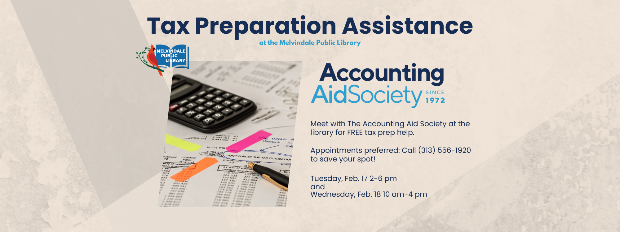 Meet with The Accounting Aid Society at the library for FREE tax prep help.
